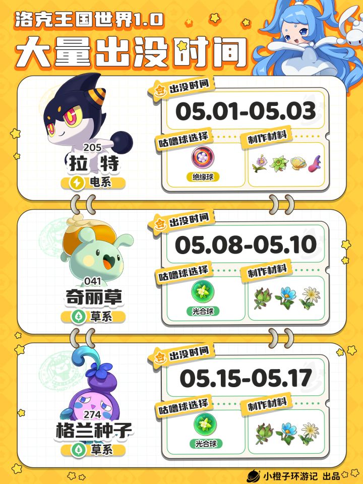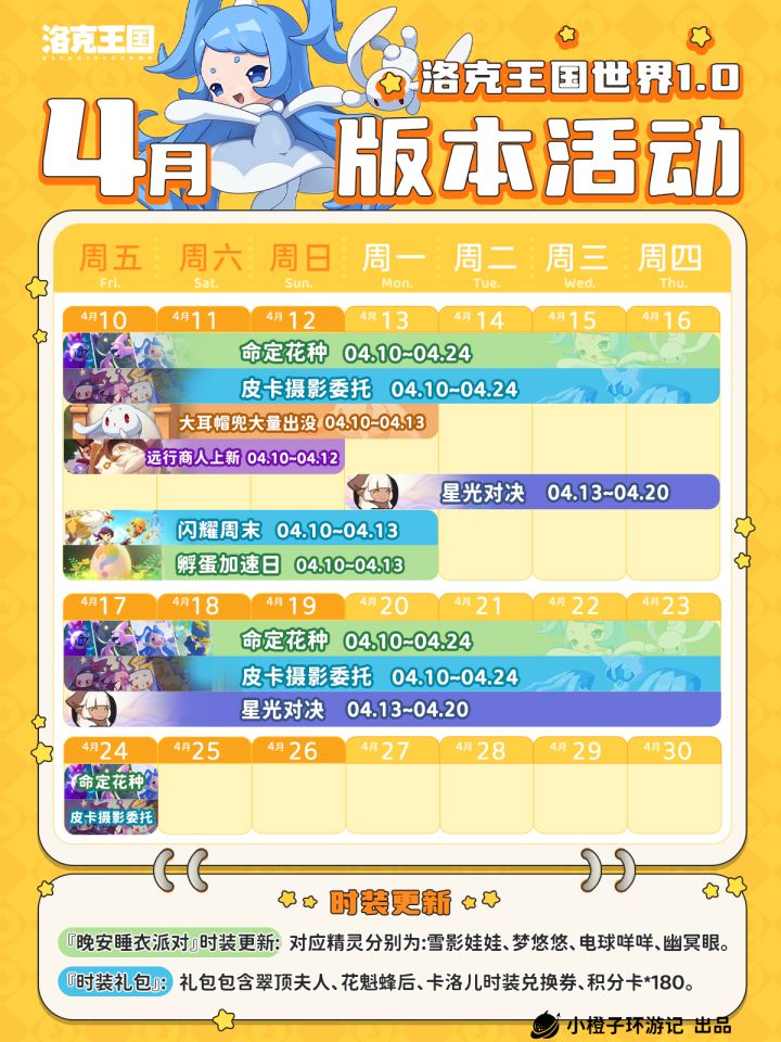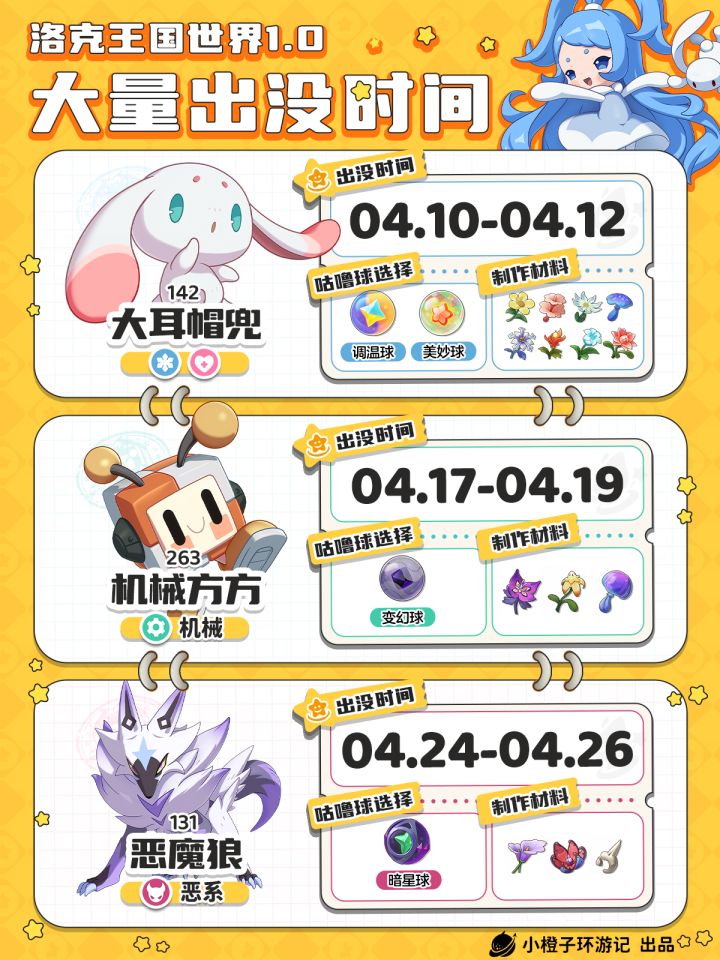 明天又有一批新活动上线啦,橙子做了一个即将到来的活动排期,小洛克可以看下,尤其注意一下大耳帽兜大量出没时间:10日~13日,记得囤好球抓异色!