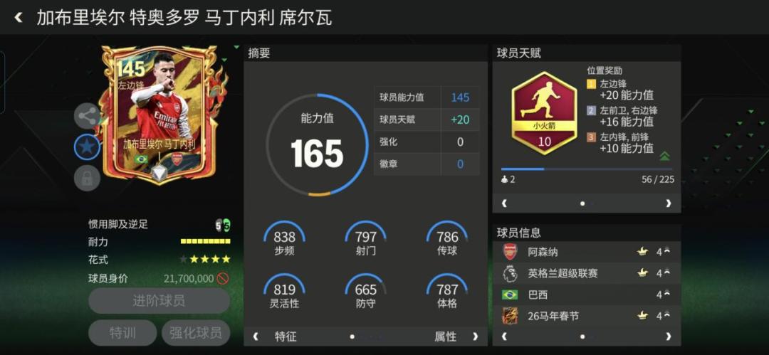 马丁内利也许会是本场的焦点,面对勒沃库森机动性不足的中后场,他的持球冲击能力恰好能得到完美的发挥,看好他能打出亮眼的表现。26马年春节马丁内利配备了小火箭天赋与四星花式,是145档位边锋里的佼佼者,他的加速冲刺与摆脱能帮助球队快速完成由后向前的球路输送,而他的内切过人更是灵动轻盈如入无人之境,是能带给人充分游戏体验的强力球员卡。