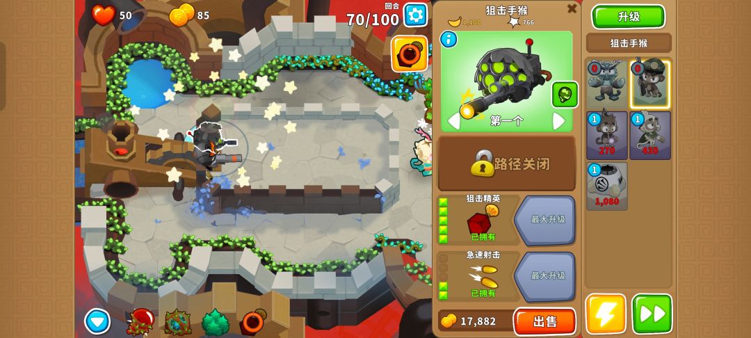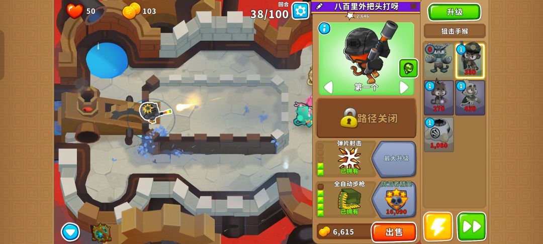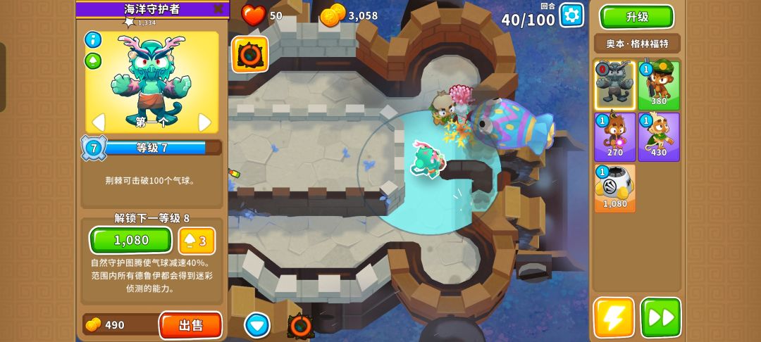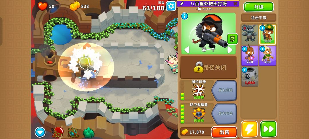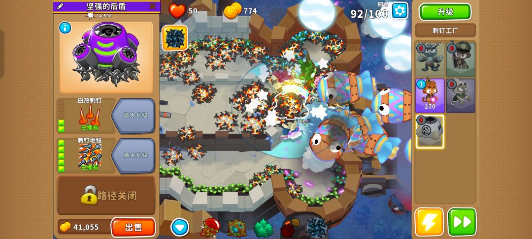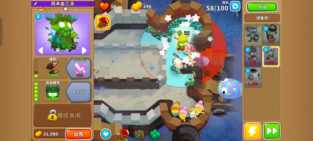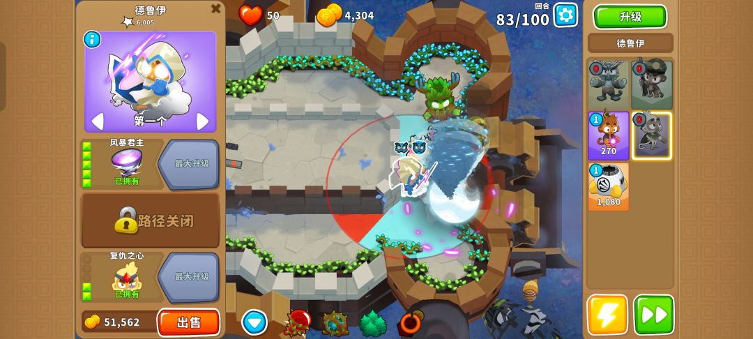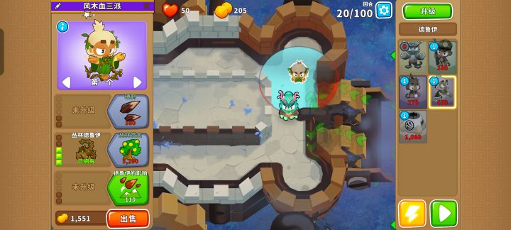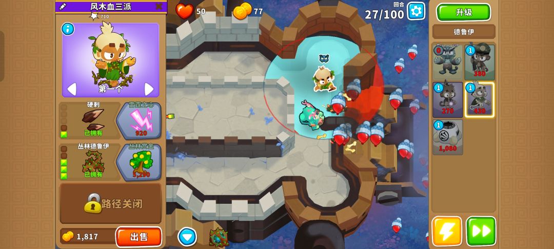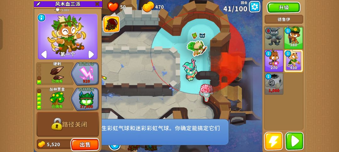之后就把德鲁伊升到140并又是熟悉的憋出150,需要用好三个不同的技能防止翻车,可以在MOAB被打爆出陶瓷气球时用德鲁伊的技能,也可以在最开始的路口用奥本的树墙技能缓解压力。