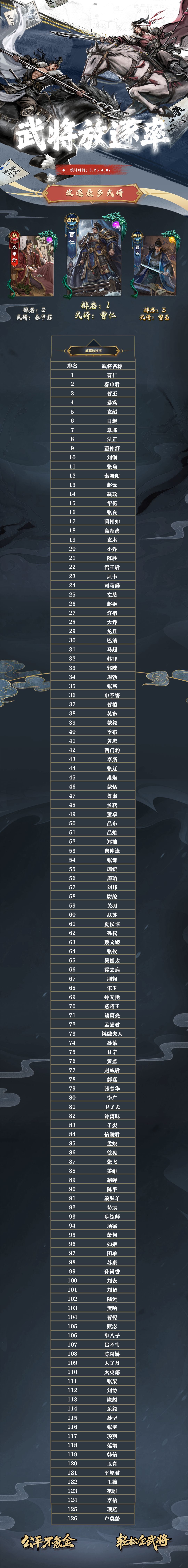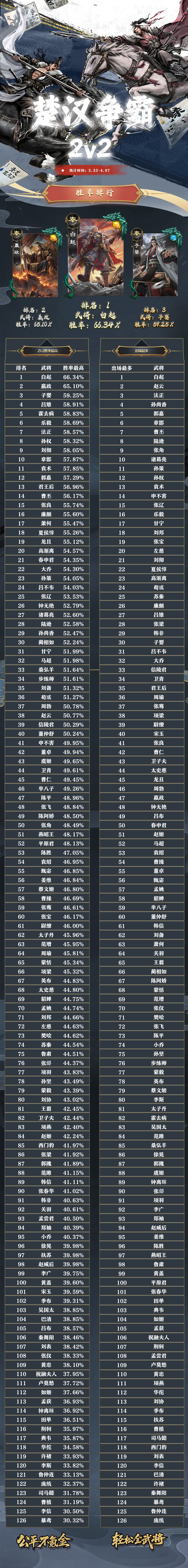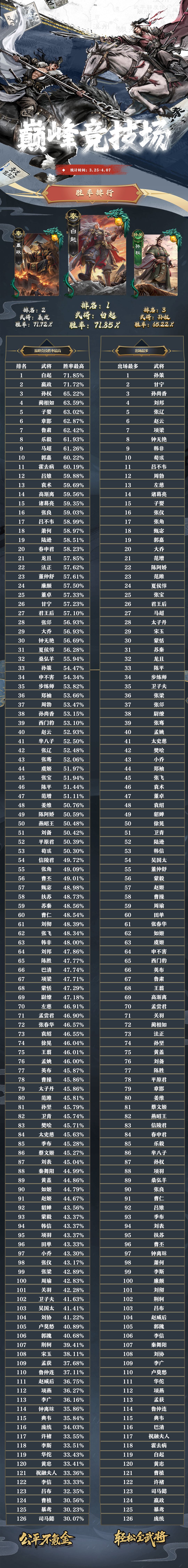 名将杀武将胜率排行(3.25~4.07)