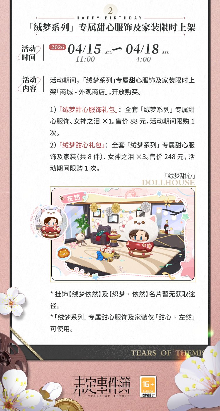 -2026年4月15日11:00-4月18日04:00,「绒梦系列」专属甜心服饰及家装限时上架「商城-外观商店」,开放购买