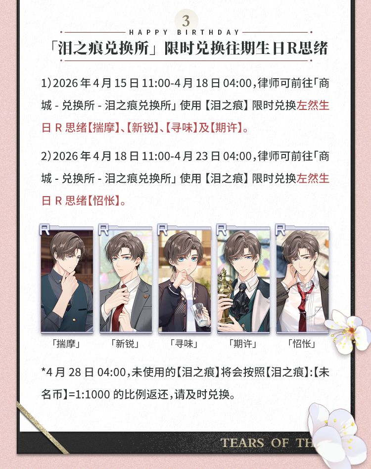 -2026年4月15日11:00-4月18日04:00,律师可前往「商城-兑换所-泪之痕兑换所」使用【泪之痕】限时兑换左然生日R思绪【揣摩】、【新锐】、【寻味】及【期许】
