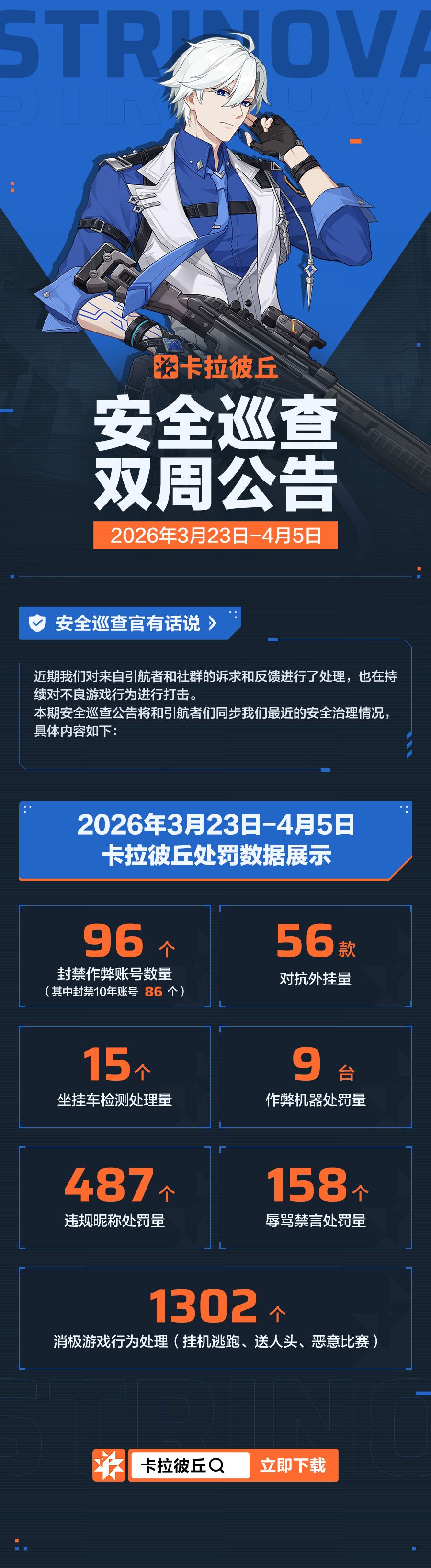 欢迎引航者收看4月0日的安全巡查公告,近期我们对来自引航者和社群的诉求和反馈进行了处理,也在持续对不良游戏行为进行打击。如有账号封禁问题可以参考下方官方网站中的公告,或通过启动器或游戏内联系客服进行反馈。