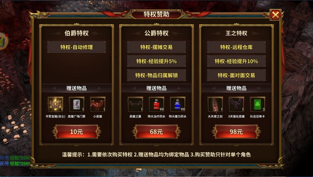 (一)打金门槛对于刚入坑的新手来说,前期打金的门槛并不高,首先要达到的是等级要求:角色等级升到80级150级是两个节点,80级解锁恶魔广场,150级完成一转,支持有效产能。投入方面,想高效搬砖,微氪78元(10元伯爵特权+68元公爵特权)最优选,解锁摆摊+面对面的完整交易权限,还能获得自动修理、远程仓库和10%经验加成,是前期打金的核心门槛。