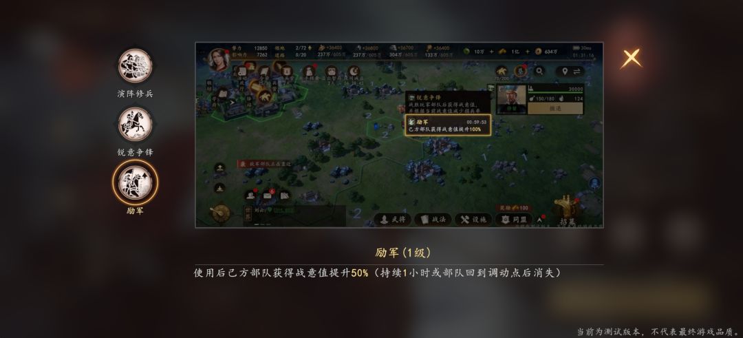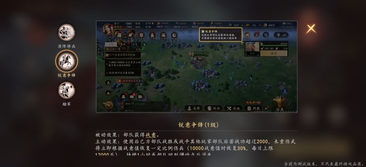- 效果:被动为部队提供「战意」属性,战胜玩家部队后可累积战意,并根据当前战意降低损兵率;主动效果为:己方部队战胜/战平玩家部队、战功超2000且未重伤时,按战意值恢复伤兵(10000战意恢复30%,每日上限12000兵),持续1小时。