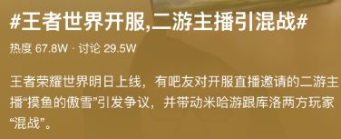 《王者荣耀世界》PC 端将于 4 月 10 日 7:00 正式开服,官方提前公布的开服教学团主播名单,却意外引发二游玩家大规模争议,米哈游与库洛两方玩家陷入 “混战”,相关话题热度飙升至 67.8W,讨论量近 30W。