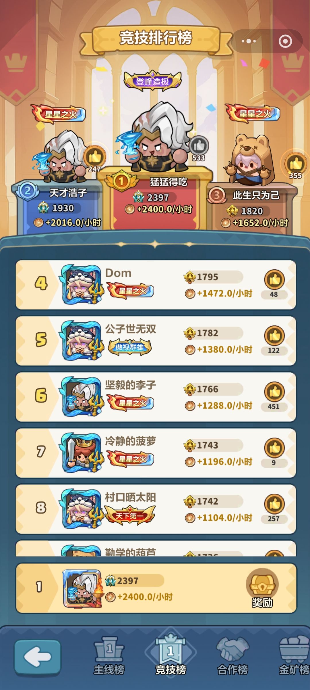 如图所示,开服第6天,双卡党,肝帝,不屯资源的情况下,能做到所有排行全第一,当然也是没大佬。