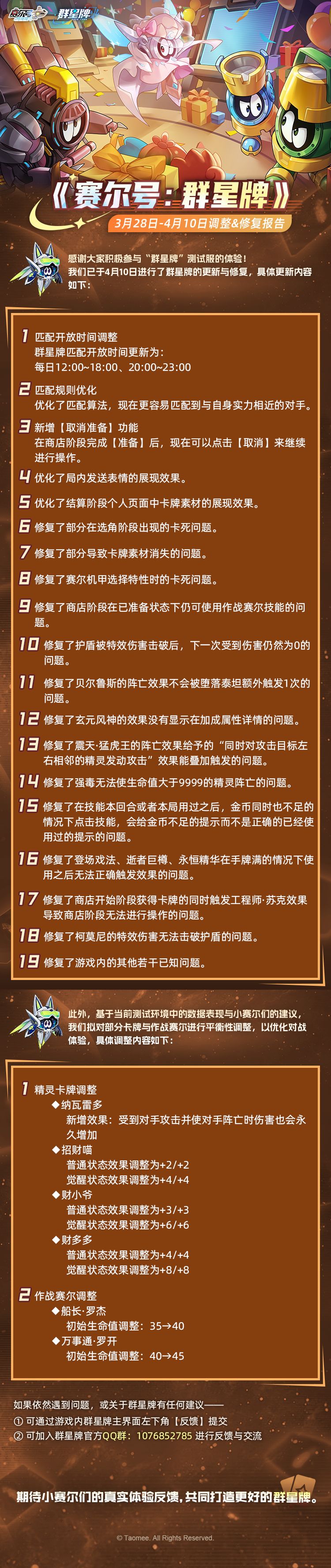 我们于4月10日版本更新后对群星牌进行了更新与修复,详细内容请查看下方长图。