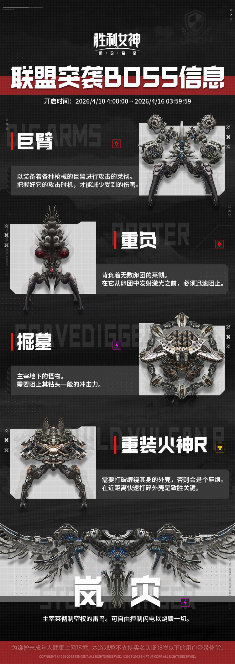 今日,《胜利女神:新的希望》官方发布【联盟突袭预告】,核心联盟协作玩法联盟突袭将于2026年4月10日4:00正式开放,邀请各位指挥官与盟友并肩作战,合力挑战强力BOSS,争夺排名赢取珍稀奖励。