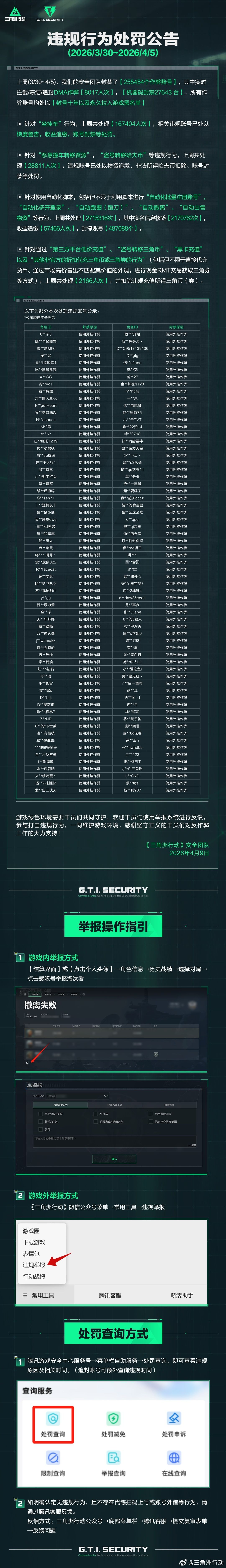 公告明确公示了上周(3/30~4/5)的反作弊处置数据,安全团队共计封禁255454个作弊账号,针对危害性极强的DMA作弊,完成实时拦截、冻结及追封共计8017人次,同时执行机器码封禁27643台,全方位、多维度打击各类游戏作弊行为,不留违规漏洞。