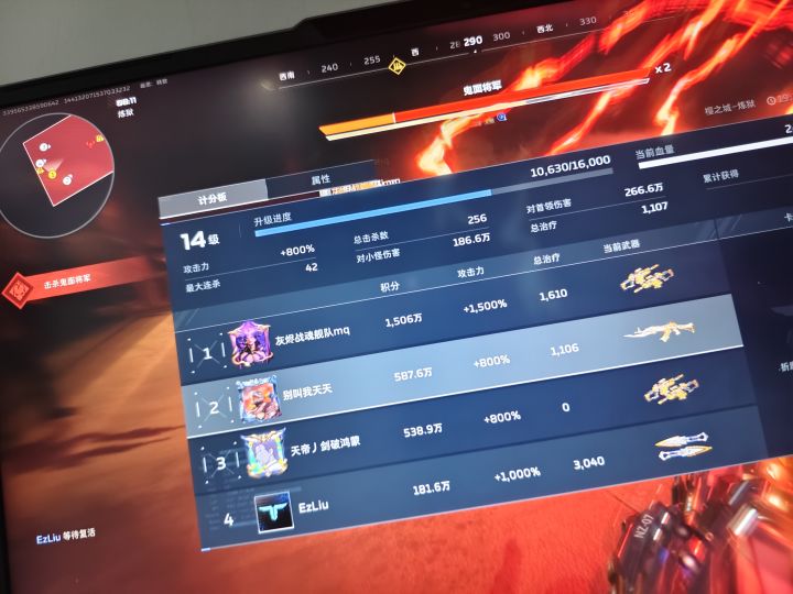 兽神+暗夜真给我玩笑了,八百攻击力,输出碾压1500攻击力,而且我刀是樱之殇没带加成的。趁着boss开大我截图,这个爆发六连枪,真的解压。这哥们被最后一名养到1500攻击,前期钱全给他了一分不留,然后第一满级了我们仨给最后一名钱帮他到八百,是这个样子。