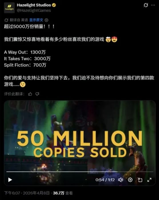 2026年4月9日,热门合作游戏《双人成行》的开发商瑞典Hazelight Studio正式发布喜讯,工作室旗下三款核心游戏全球总销量成功突破5000万份,达成全新销量里程碑,官方也通过社交平台发文,向全球玩家的支持表达诚挚感谢。