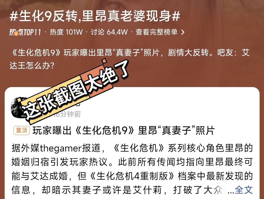 据推特网友爆料,早前卡普空在《生化4重制版》中出现过成年版艾什莉照片,随后删除行为结合《生化9》明确揭示里昂已婚的剧情走向,玩家们认定里昂的妻子就是当年那位被戏称为碍事梨的总统千金