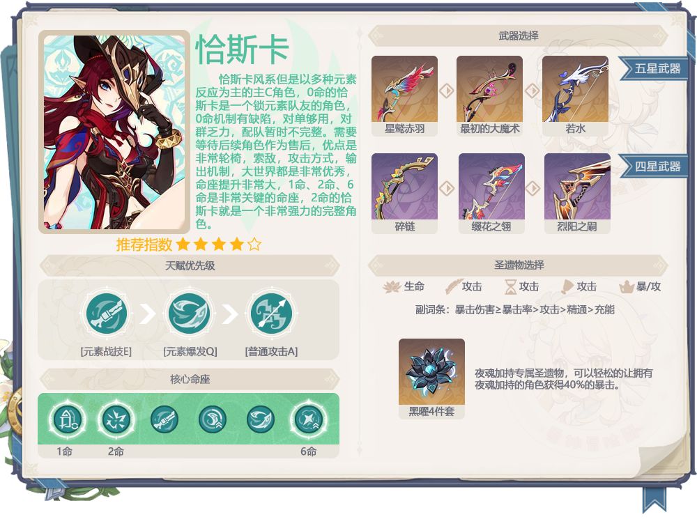 2、恰斯卡抽取建议:萌新开荒跑图可以抽取,强度党玩家建议至少要抽2命,能打出多种元素伤害,几乎不受环境影响,满命依旧是顶级角色,值得抽取