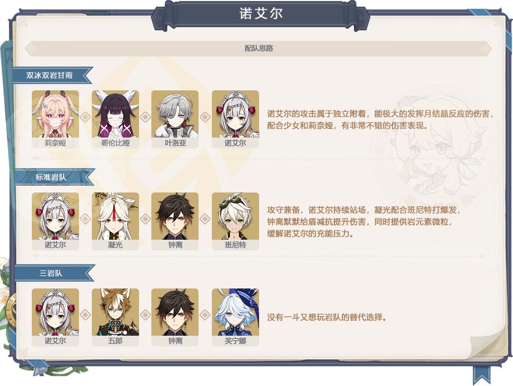 5、诺艾尔抽取建议:开服老角色了,只要抽了新手池一定有,凭借刀刀附着的顶级机制猛喝了一大口月结晶的汤,但命座对月结晶玩法几乎没有帮助,仅六命延长大招时间有用,没必要专门抽。上半的两个五星角色中,莉奈娅是月结晶必抽的角色,也是不错的对策卡,是比较推荐抽取的,恰斯卡开荒跑图非常好用,2和6命也非常有补的价值,陪跑的四星叶洛亚对月结晶非常重要,剩下两个虽然能用但都是白送的,没必要专门去抽