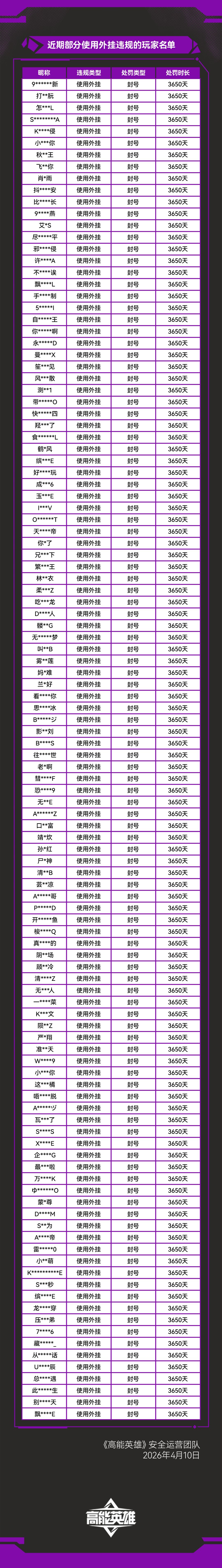 《高能英雄》外挂作弊处罚公告(4月10日)