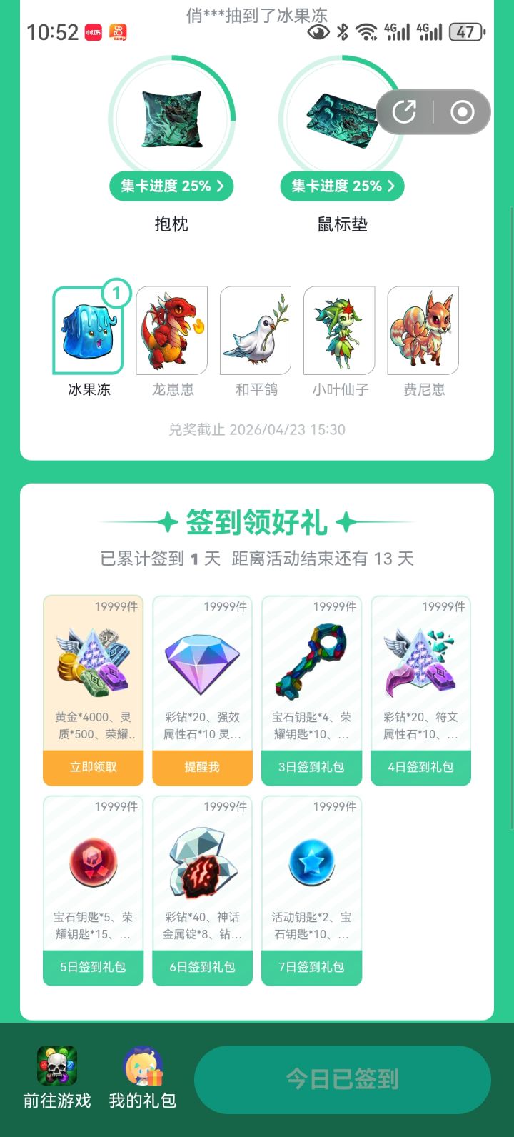 现在处于测试阶段,站内七天签到均有道具可以拿,集卡更有可能获得抱枕以及鼠标垫。