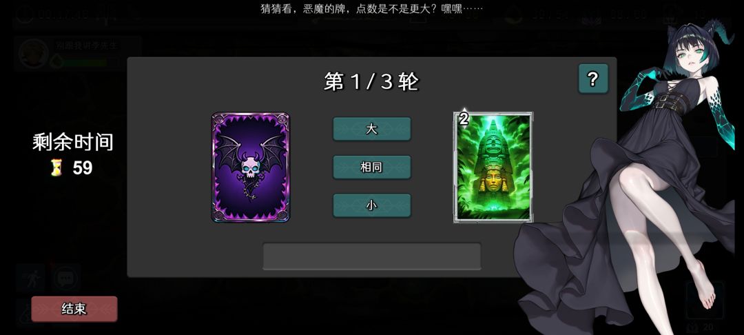 1)翻牌五选一,推荐只翻一次,左下点结束领奖励。第一次无恶魔牌,第二、第三次有一个恶魔牌,第四、第五次有两个恶魔牌,翻到恶魔牌失败且失去所有奖励。注意翻牌游戏掉血非常高。