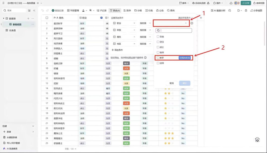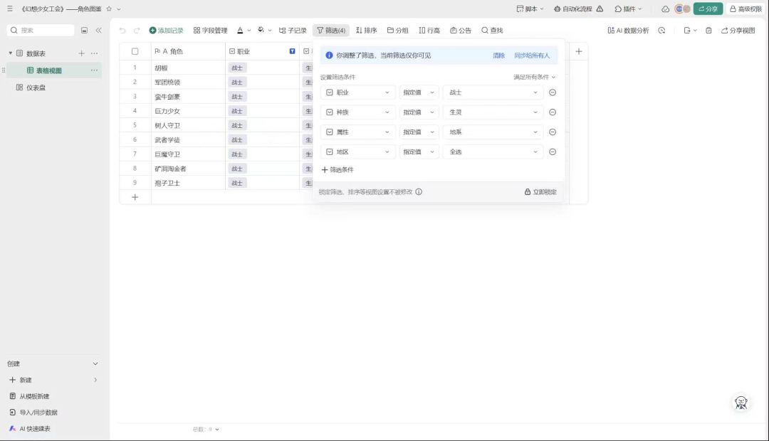 1.点击上方的编辑,我选择了四个筛选条件,分别为职业,种族,属性,地区。如果没有,点击筛选条件自行添加,默认为全选。