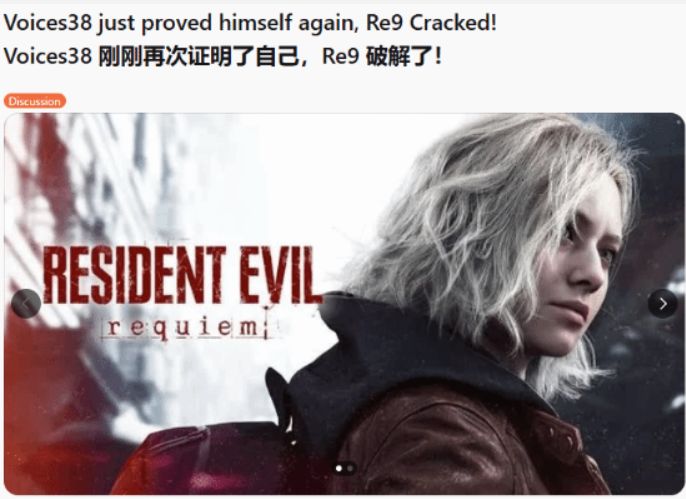 游戏破解圈迎来里程碑式消息,卡普空3A大作《生化危机9:安魂曲》Denuvo加密惨遭破解,成为2026年首款被彻底攻破的D加密新游戏,从发售到破解仅耗时41天,由知名黑客voices38完成这一突破。