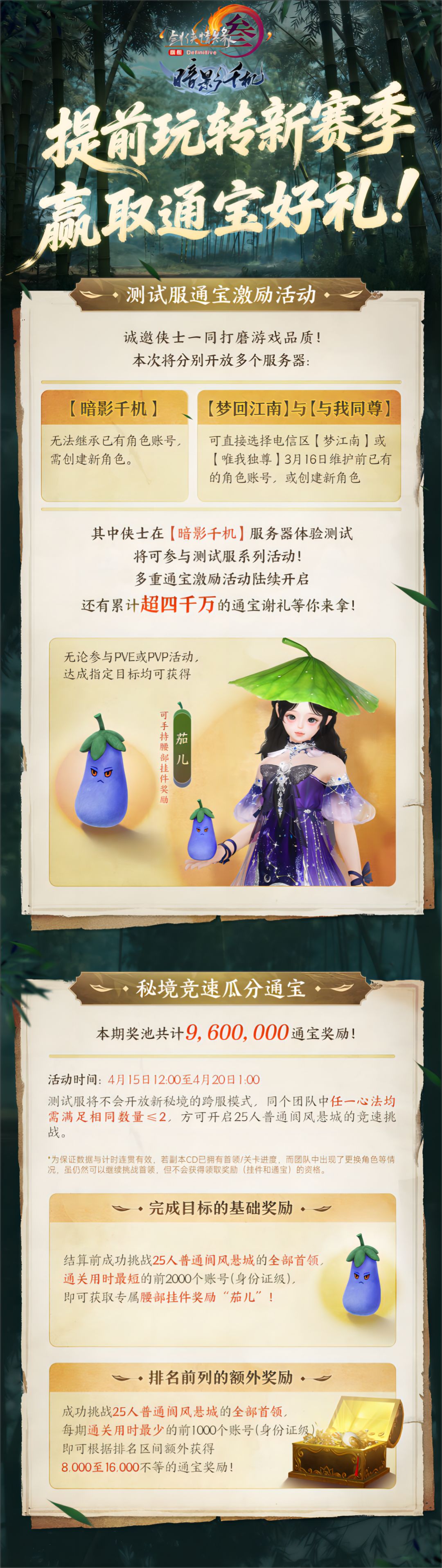 与此同时,测试服10人与25人普通难度“阆风悬城”的五号首领开放挑战!新一轮通宝激励即将上线,全新玩法“扬刀大会·影”闯关有奖,万物互联端名剑大会通宝激励活动同步开启!侠士使用移动端或极速端完成目标即可获得专属腰部挂件奖励“茄儿”与平分1500000通宝奖池,精彩好礼不容错过!