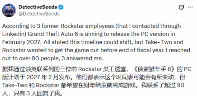 爆料人DetectiveSeeds通过LinkedIn联系90多位前 Rockstar 员工,仅3人回复且口径一致:Rockstar 与母公司Take-Two敲定这一时间,核心目的是赶在财年结束前上线,冲刺财报业绩、冲击营收纪录。Take-Two财年截止为3月31日,2月发售刚好能计入当期财报,最大化商业收益。