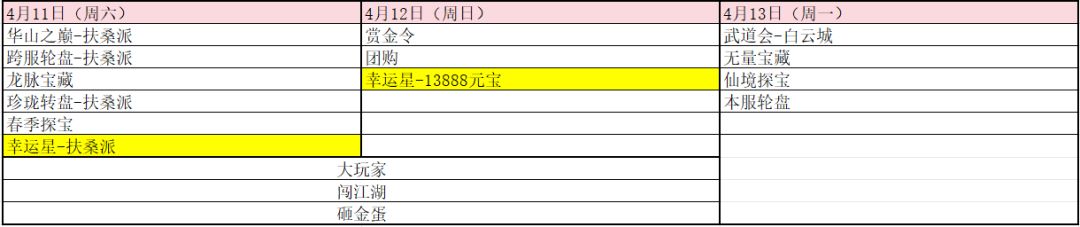 掌门,在新武娘到来之际,我们也同时对接下来的活动进行了调整,请掌门和我们一起来看一下吧,首先是新卡上线期间的每日活动变动: