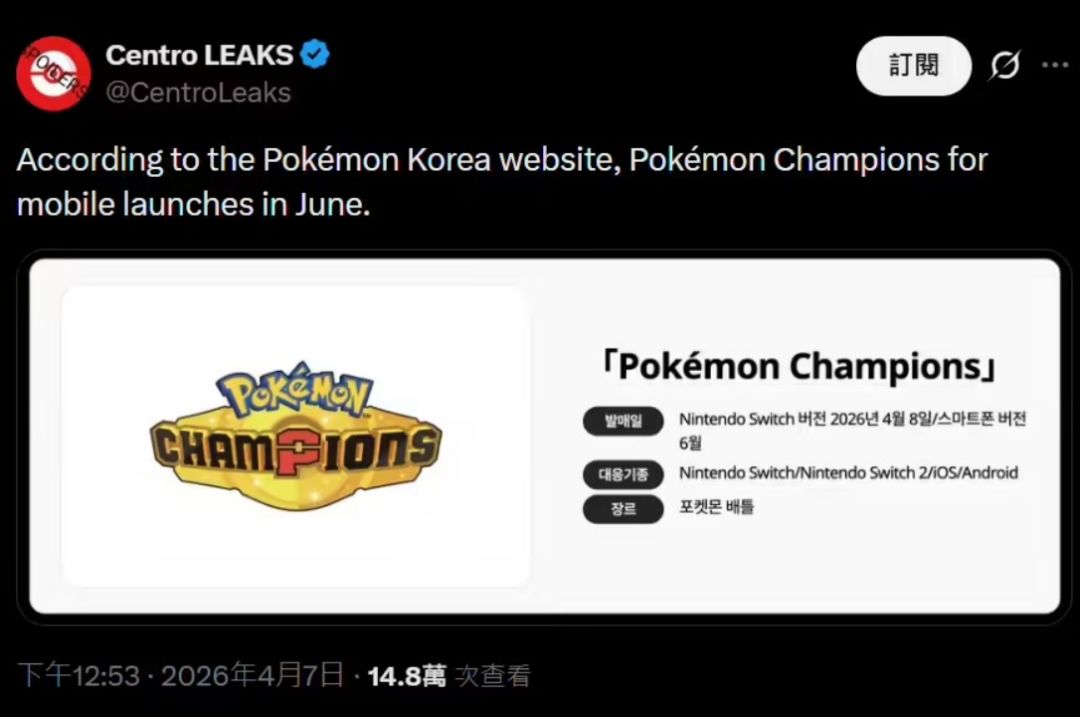 由由Game Freak与宝可梦公司联合开发、登陆于主机平台的免费策略竞技游戏《宝可梦:冠军》近日传出消息,据韩国官方网站显示,手游版本预计将于今年6月正式上线
