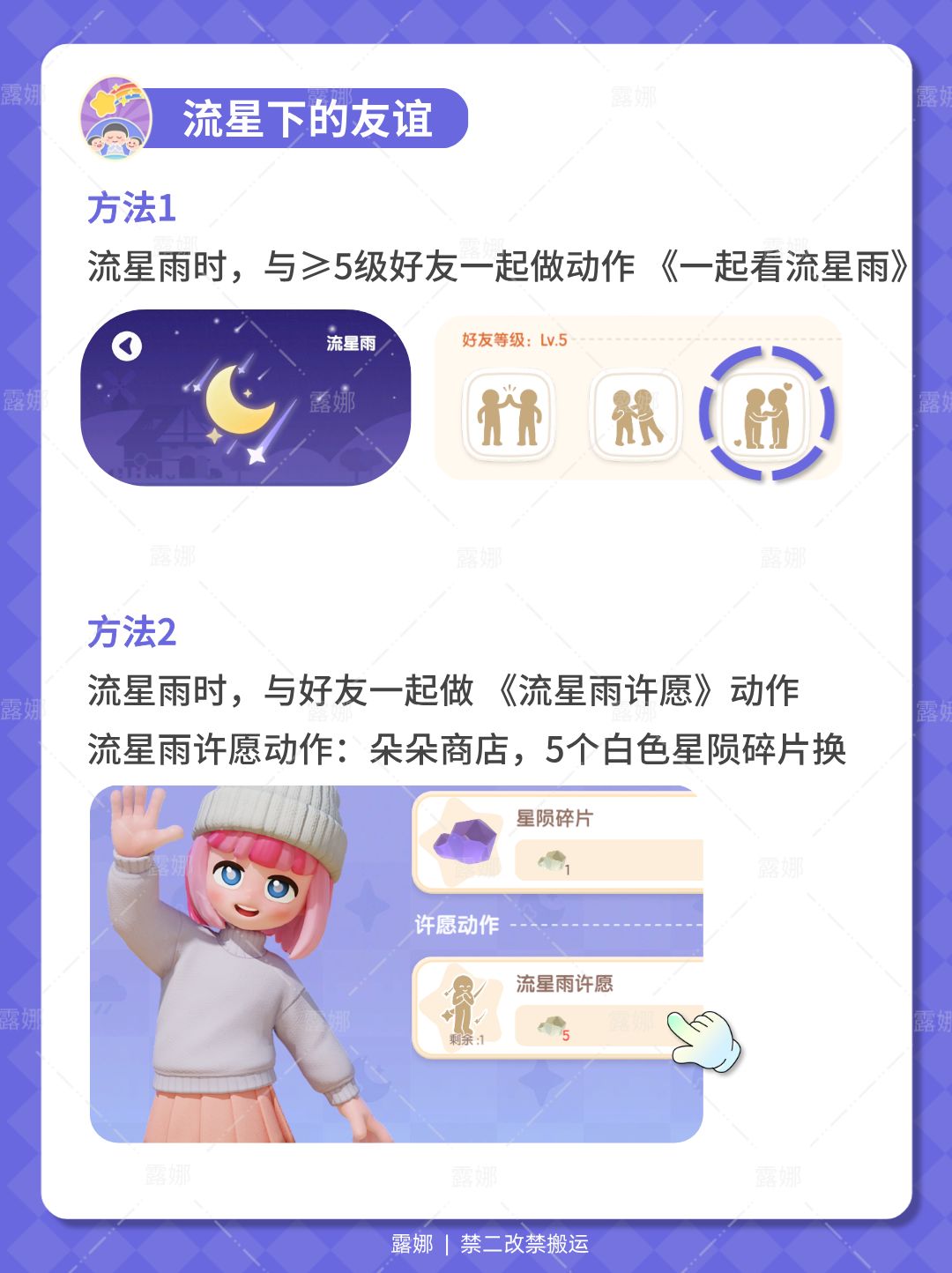 流星雨玩法: 砍陨石 → 得碎片 → 找朵朵 → 换家具