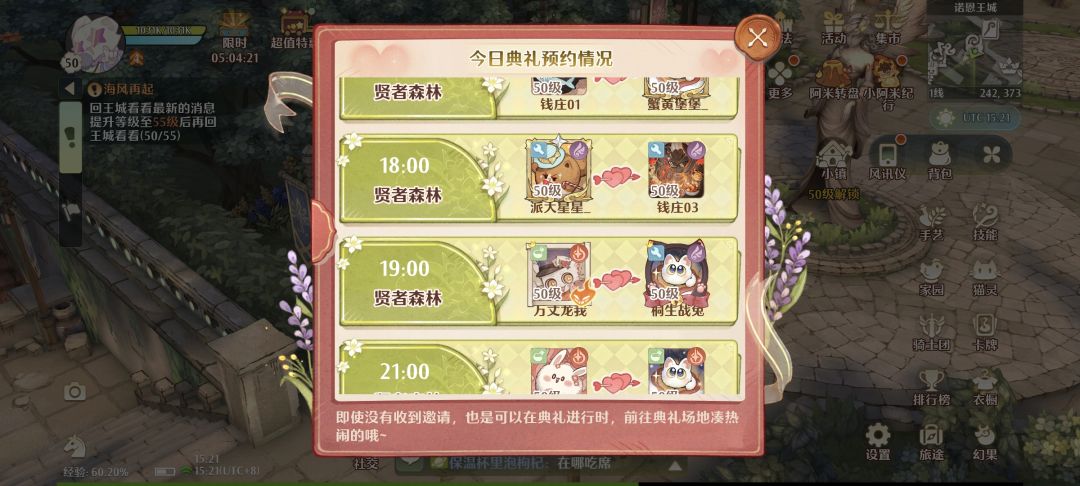 不过现在也想不了那些,今天收到了七八张请帖,打开典礼预约,每天都排的满满当当,倒有种普天同庆的欢乐感。这种欢天喜地的场景大概只有在开服之初能看到吧。