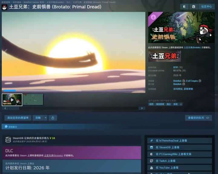 4月10日,在备受瞩目的3i计划独立游戏发布会上人气Roguelite游戏《土豆兄弟》正式揭晓了其最新大型扩展内容–DLC史前惧兽![[TapTap表情|TapFamilyxdoro2_粉狗比心]](https://img-tc.tapimg.com/market/images/101c7e3200596fe8e03765080b467fb8.gif)