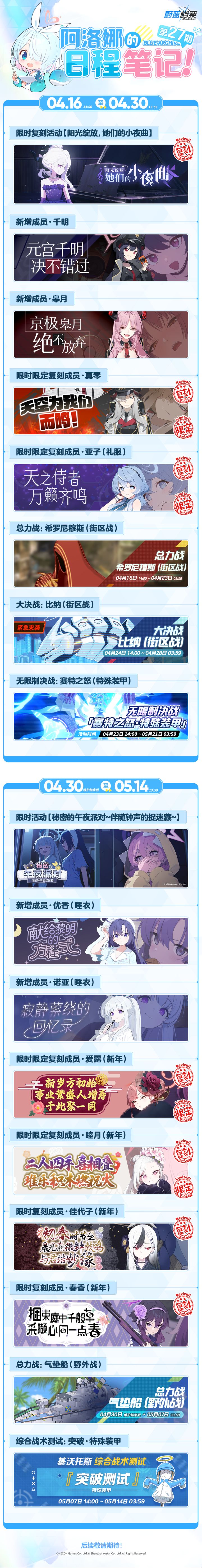 📚 蔚蓝档案第27期日程笔记发布,睡衣优香、睡衣诺亚等角色即将于月底实装