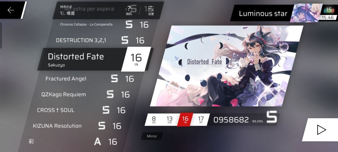 15.44→15.46(DESTRUCTION 3,2,1重新回b位,不过准度依旧一坨)(Distorted Fate时隔两个月重回b1(打完的时候太紧张了,蹭到了重开,所以没截图,好像是9/2/3🤔)。°(°¯᷄◠¯᷅°)°。)