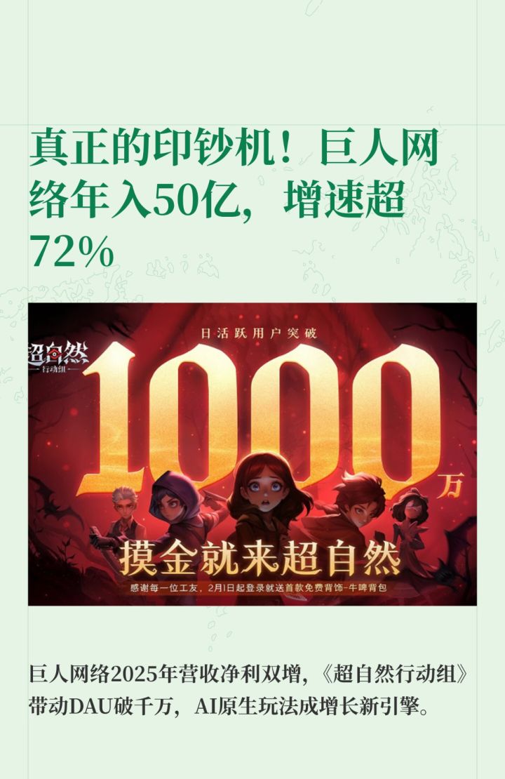 更值得期待的是,增长势能延续至2026年一季度:公司预计净利润10-12亿元,同比暴增187.47%-224.96%,扣非净利润9.5-11.5亿元,同比增长162.19%-217.38%。这意味着《超自然行动组》的长线运营持续发力,AI技术赋能下的产品矩阵,正为巨人网络打造出可持续的第二增长曲线,领跑行业增长。