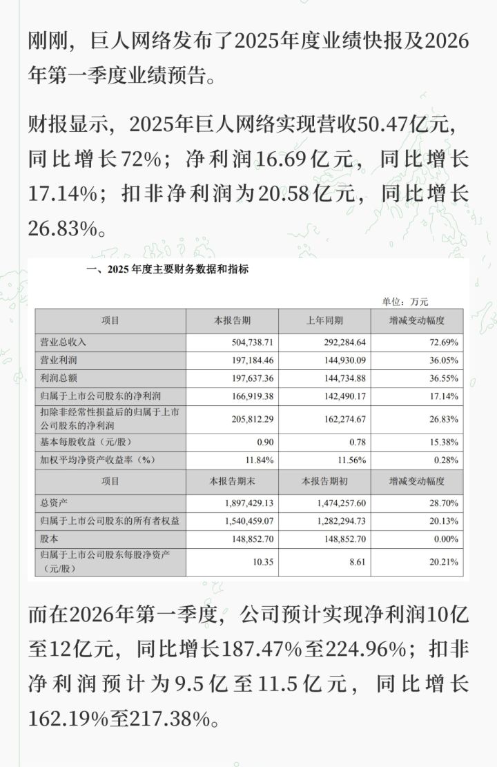 巨人网络2025年业绩快报正式出炉,交出了一份营收净利双增的亮眼答卷:全年实现营收50.47亿元,同比暴涨72.69%;净利润16.69亿元,同比增长17.14%,扣非净利润20.58亿元,同比增长26.83%,多项核心指标大幅跑赢行业,堪称游戏圈的“印钞机”。