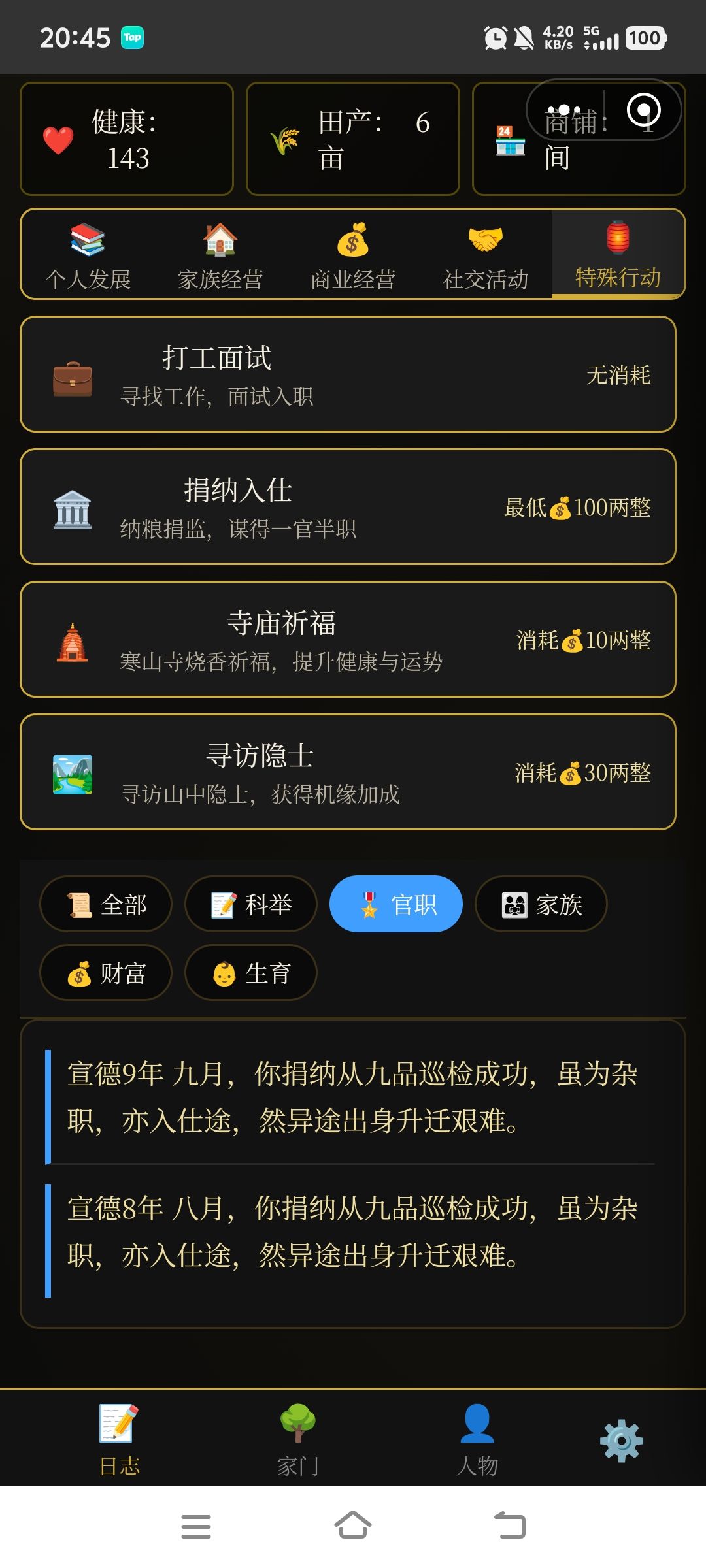 我不知道是不是没做完还是说卡bug了,好像捐纳完600两之后只有个提示,根本没有授予官职,我甚至可以重复捐纳,然后触发这个提示(如图1),感觉就是在⭕银两,不管你是童生还是秀才,捐纳完都无法被授予官职。