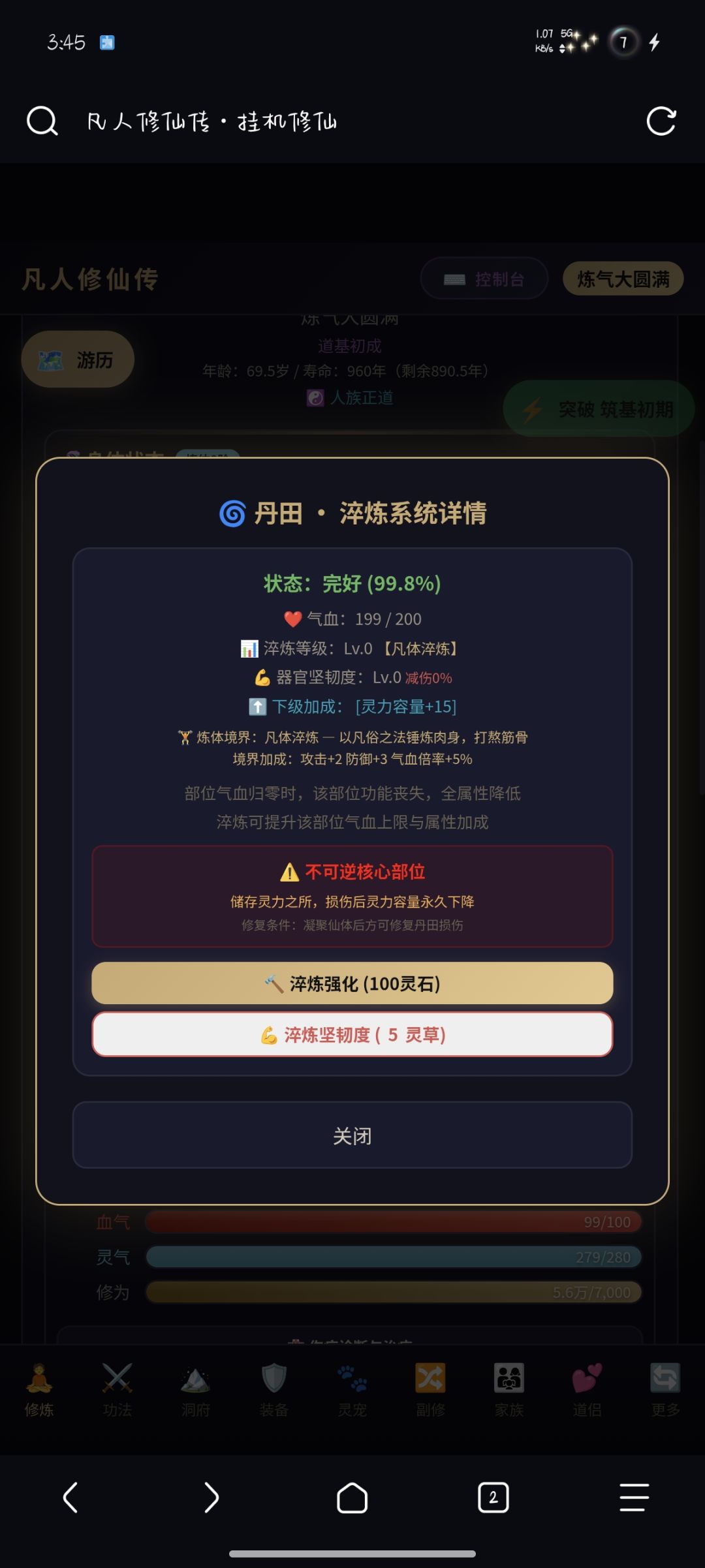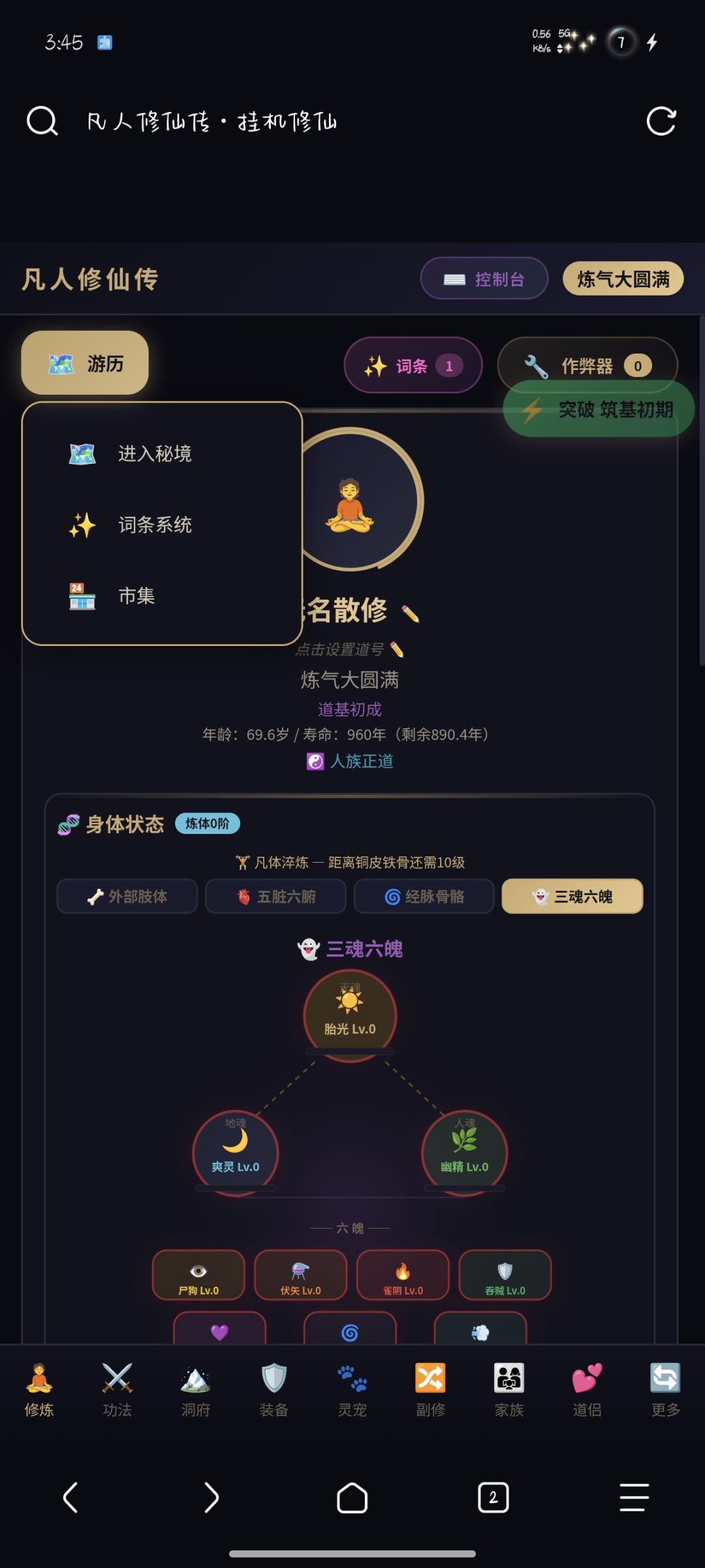 2.功法系统 — 凡级→神级→至高级功法,法修/体修双路线,支持自创功法(自定义名称与属性)