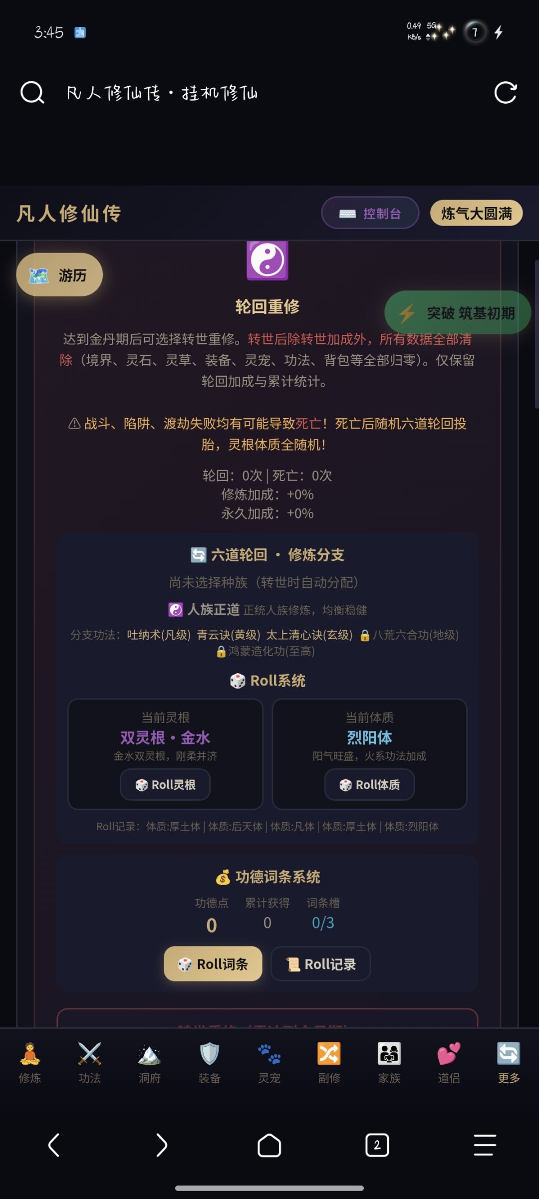 3.灵根&体质系统 — 五行杂灵根→鸿蒙灵根(8品质分级),随机投胎转世,搭配数十种体质(虚弱体→仙王体)