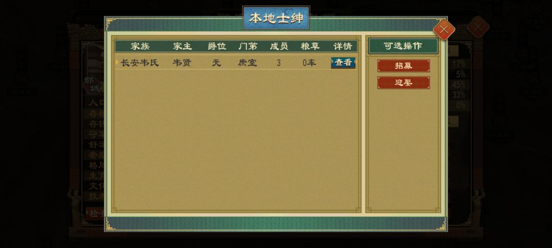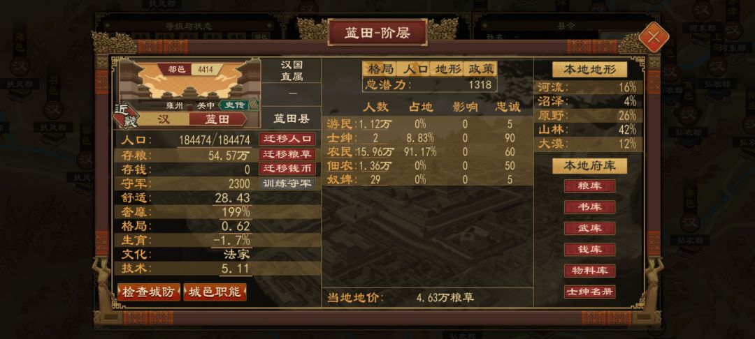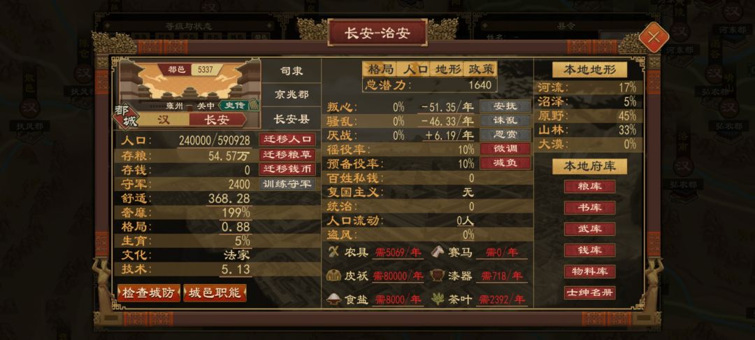 其次贸易系统,可以说是极其不合理,完全需要大改。一,在商肆可以买武器是什么操作,如果卖别国武器,那也只有马匹。而且简化生产后也不用担心产量不够。二,皮袄纸卷等民用物资贸易,也可丰富改进,以民间贸易为主,即取消股份机制,设置繁荣度系统。以少量生产,控制价格,商税为主要手段。1,民间贸易士绅根据地区物产建造生产贸易,玩家可以少量生产,设置工宫,根据地域物产一键设置生产计划。不是为满足需求,而是为丰盈府库,增加繁荣度,平衡物价即可。贸易越繁华,钱税越多,同时减少因土地兼并造成的流民数量概率。2,设置物价系统价格临界值,某物达到价格临界值,弹窗提醒玩家通过买入或卖出调整价格,而物资工坊对城邑的增益效果可以改为商肆价格对区域内城邑影响,既价格合理提供正增益,价格不合理提供负增益。如皮袄价格不合理冬季则造成人口减少。农具价不合理则造成减产。3,粮食价格更是重中之重,其负影响可设置为粮价不合理,造成人口减少,粮食减产,士绅农田占比增多,农民占田减少,当占比达到某程度,游民数量增多,数量根据城邑人口和占比,供养上限,工商繁荣度。游民数量增多,而非全部抓进监狱解决,而是转化为流民,移民,代赈等多种处理手段。而流入则应设限,考虑地价,农田数量,粮食储备,工商繁华度多重因素。