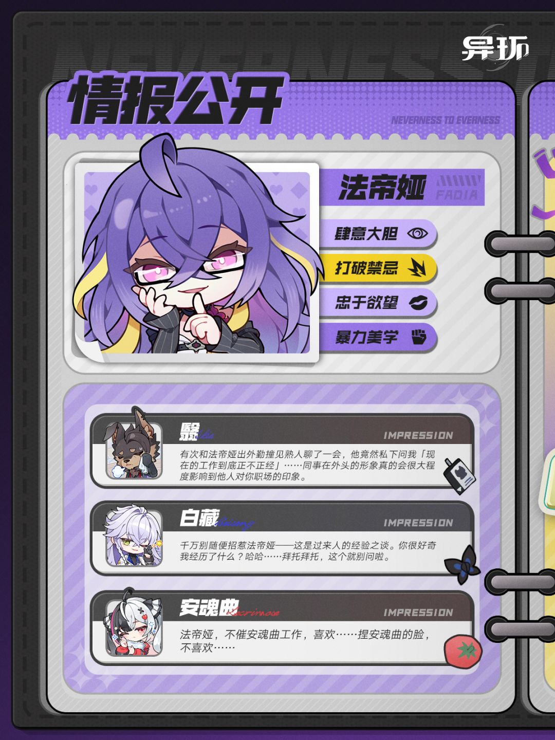 据悉,法帝娅的此次闲趣时光后续将随游戏相关活动或版本更新正式上线。目前官方尚未公布具体的获取方式与上线时间,欢迎各位玩家持续关注《异环》官方后续公告,抢先解锁法帝娅的专属休闲时刻,与她一同享受这段充满惊喜的闲趣时光。