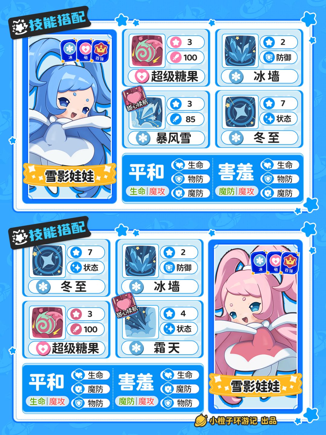 ②雪影娃娃的技能固定的是冬至+冰墙,一般会带1~2个输出技能,【甜心续航】、【霜天】作为状态技能也非常优秀,可根据环境以及阵容进行替换。