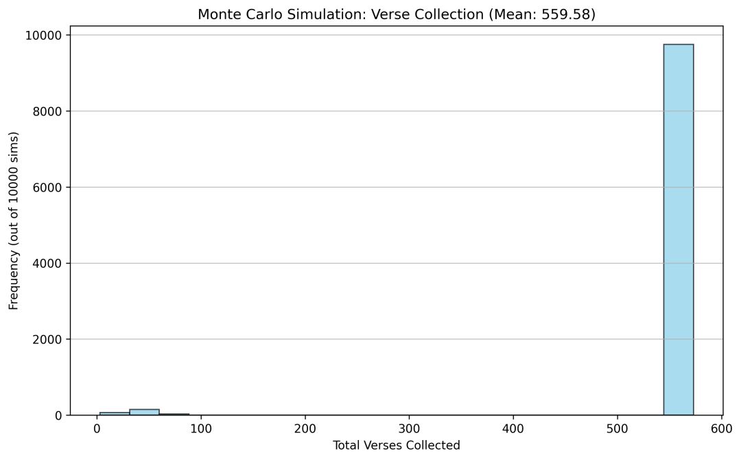 这是单杜甫时的蒙特卡洛结果。横坐标是集句的句数,纵坐标是出现的次数。我们可以发现,在一万次的模拟中,除了个别几把真的是被系统做局早早夭折,几乎所有情况下单杜甫都可以集完诗句库中的所有诗句。这说明单杜甫有足够的信心掏空集句系统的强度,杜甫就是集句系统本尊,其余集句名臣也因此不太需要给杜甫提供灵犀、相粘等,毕竟杜甫一个人足以杀穿集句系统——只要有足够的时间。