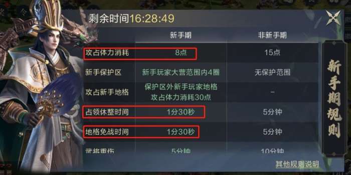 1. 玩家第一时间进入游戏后,快速将系统引导任务看完,利用新手保护期(48小时)机制快速配合一套主力阵容开荒势力,提升自身的势力值,新手期阶段第一天都是能够达到3000势力值以上的。在新手期内搭配阵容开荒土地增加势力值,新手期内体力每次消耗只有八点,占领后冷却时间为1分30秒,武将重伤为五分钟,武将配上去的兵力卸甲以及武技点会100%返还,前两天快速消耗武将体力发育自己势力值。大家都可以去看看新手的规则说明