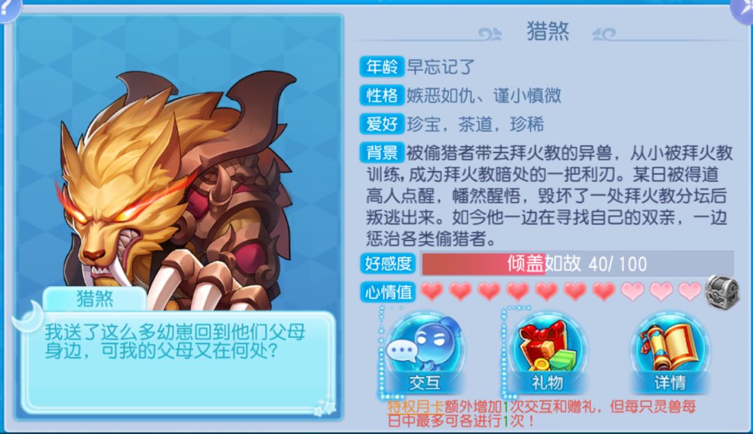 活动内容:很多少主通过每日好感度任务获得了一些强力三星,比如猎煞、霸下、鱼猫等,不知道你平时和哪个宠物互动最多,好感度最高呢?截图分享到评论区一起看看吧