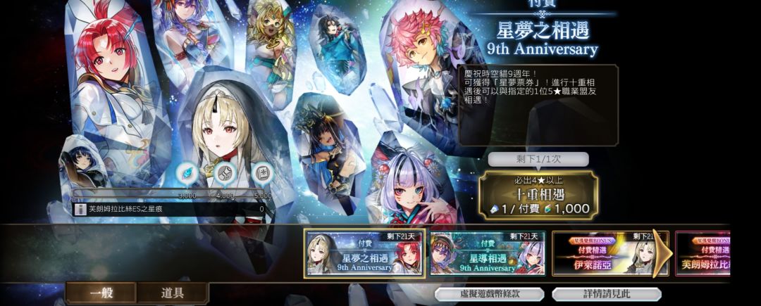 免费石头不多,不想再抽了,另外这周年池子只能付费而且只能一次,现在工钱还没到手,等到手了充一个星梦拿一个精灵。至于es泰坦我有本体所以也不抽了。(⑅•ᴗ•⑅)。