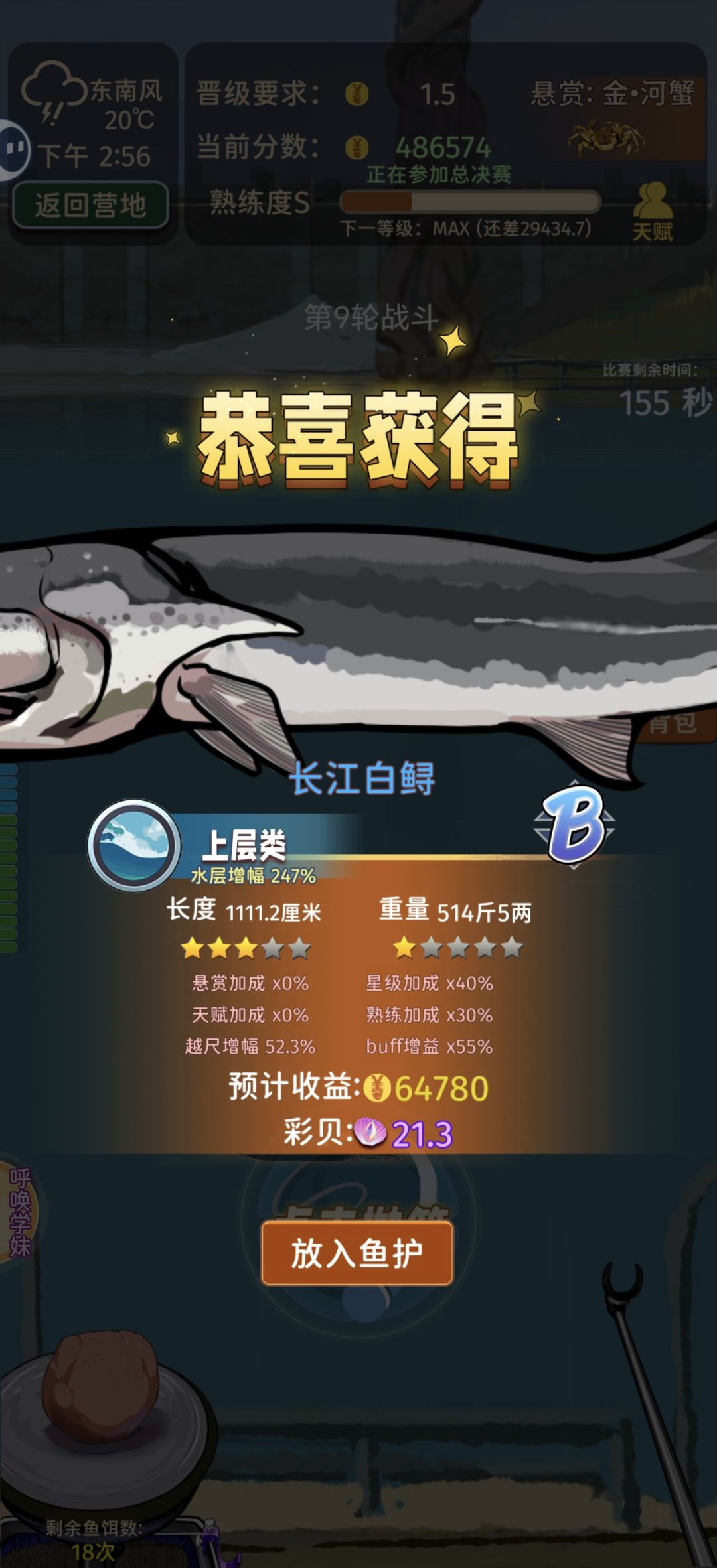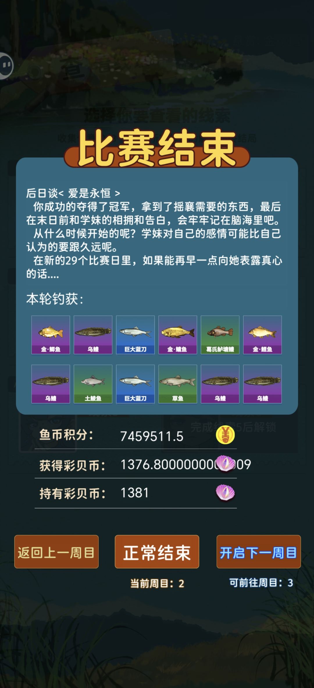 一周目用的天赋二周目打了两把没过,主要一个打卡机只剩百分之2了,换了天赋后,第三周就有268万,已经攒够第四周的钱了,结束时都还多了七百多万金币,这个天赋好有钱啊。紫色螺纹钢鱼竿紫色线,金色钩金色漂就过了