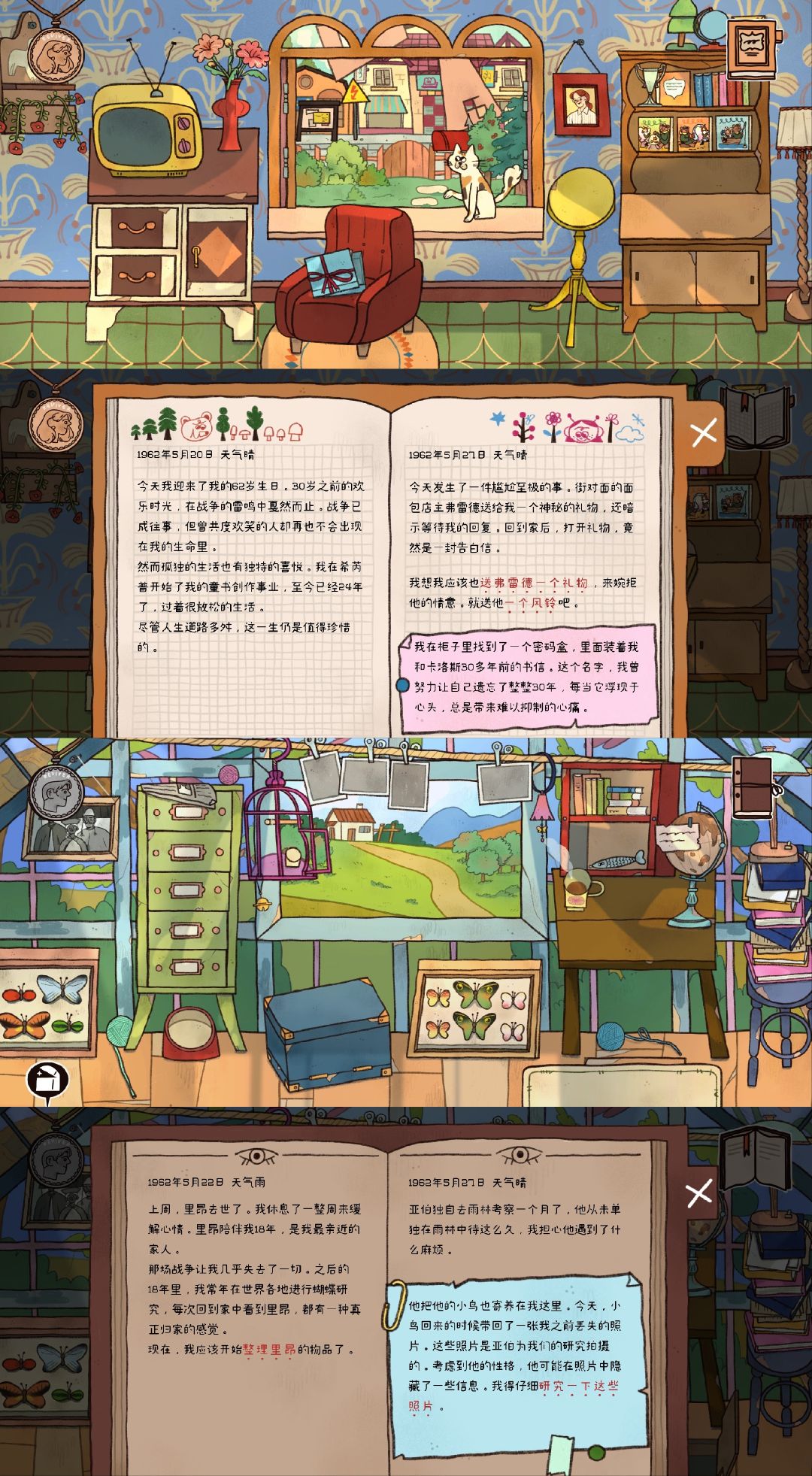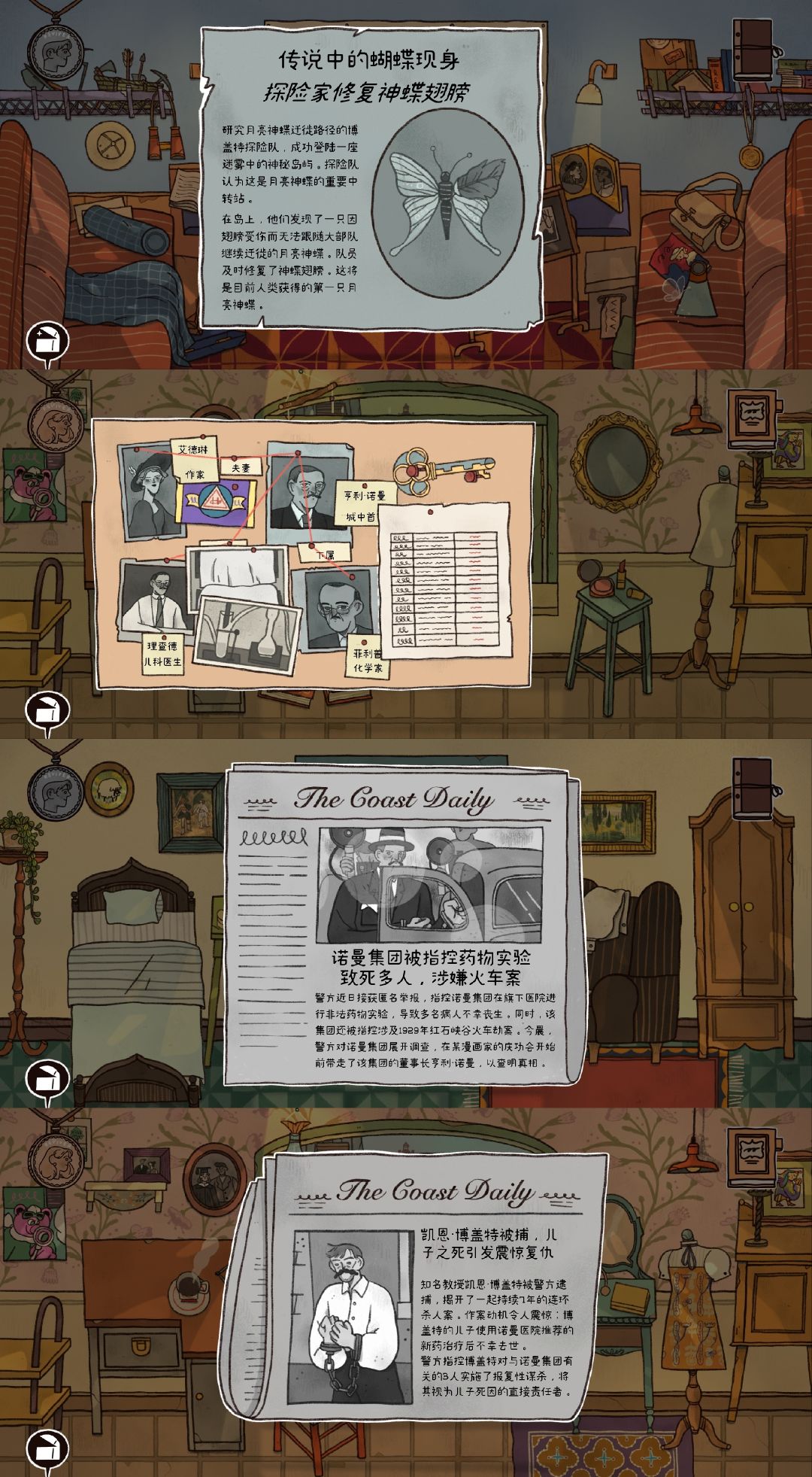 这是一个与蝴蝶紧密相关的游戏,从剧情到解谜设计,“蝴蝶”元素贯穿整个游戏。故事发生在1908年的夏天,8岁的男孩卡洛斯随父母搬到伊兹镇,在这里他认识了一生中的爱人费莉西亚。游戏包括序章和一至三章,每一章代表着不同的年份,发生着不同的事,通过过去的行为引发蝴蝶效应,改变未来的坏事。