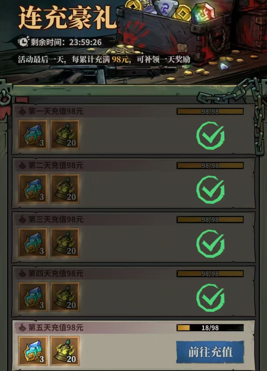 5,连充豪礼,在最后一天氪金,可以补前面的天数