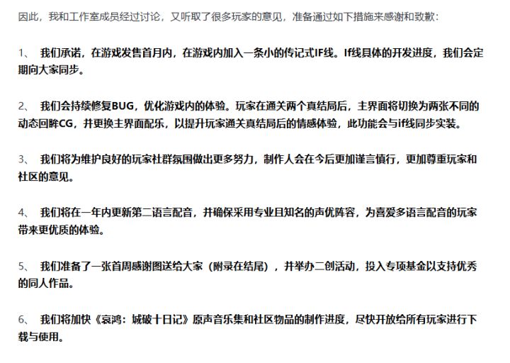 嵇零代表团队公布多项补救措施,包括在发售首月内新增传记式IF线、持续修复Bug、通关双真结局后切换动态CG及配乐、一年内更新第二语言配音、举办二创活动、加快原声音乐集制作进度等内容