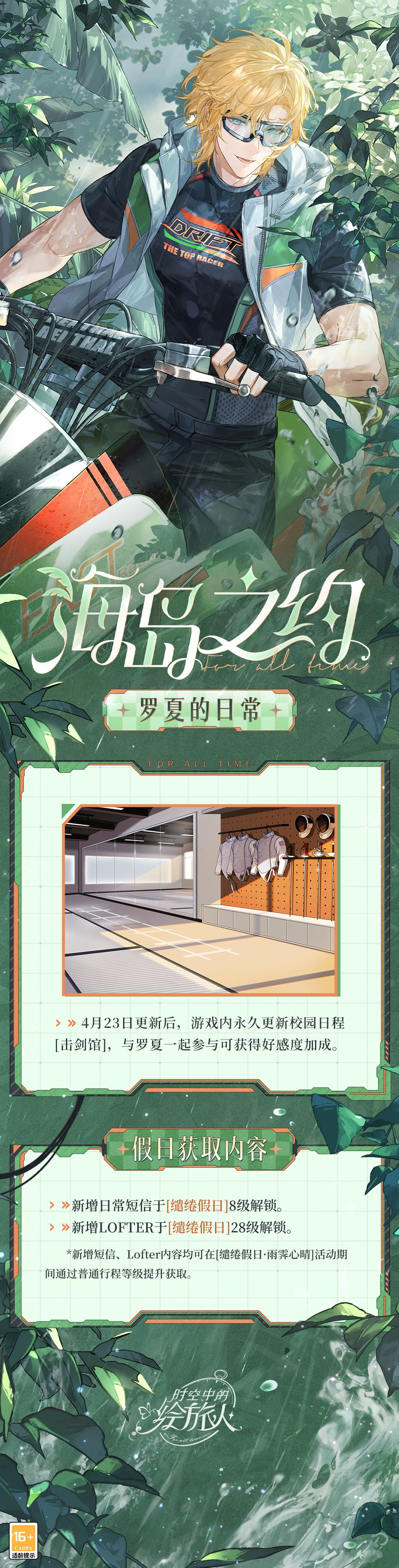 ★4月23日更新后 - 6月3日05:00,在「缱绻假日·雨霁心晴」活动期间提升[假日行程]等级到8级和28级,可分别解锁全新短信和Lofter内容。